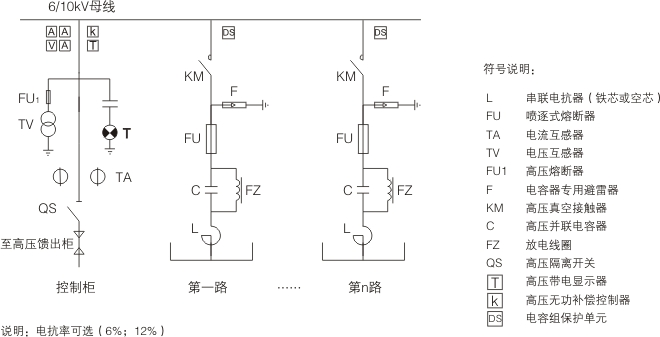 DEHVC型高壓智能無功補償裝置應(yīng)用傳統(tǒng)的投切電容器方式向系統(tǒng)中注入容性電流,補償無功功率,調(diào)節(jié)功率因數(shù)。其核心器件主要有控制器、高壓真空接觸器、電容器、電抗器及保護裝置等構(gòu)成??刂葡到y(tǒng)對系統(tǒng)電壓、電流信號進行采樣及分析處理,以功率因數(shù)及系統(tǒng)電壓為控制參數(shù)判斷并輸出控制指令,控制接觸器動作實現(xiàn)對電容器組的投切,使系統(tǒng)功率因數(shù)控制在設(shè)定范圍內(nèi)。