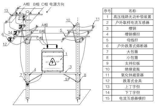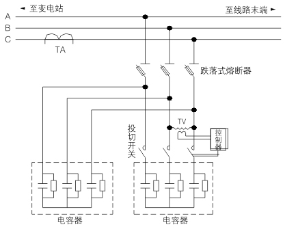 TBBZ系列高壓線路無(wú)功補(bǔ)償裝置主要由控制器,真空接觸器,電容器,電壓互感器,綜合保護(hù)器等組成。系統(tǒng)通過(guò)線路開啟式電流互感器采集線路電流信號(hào),分析判斷線路無(wú)功功率缺失容量,控制電容器組的投切,使功率因數(shù)達(dá)到設(shè)定目標(biāo)值。裝置采用戶外跌落式熔斷器對(duì)進(jìn)行短路保護(hù),一旦裝置有短路故障,跌落式熔斷器立即跳開,防止對(duì)裝置和線路造成損害。