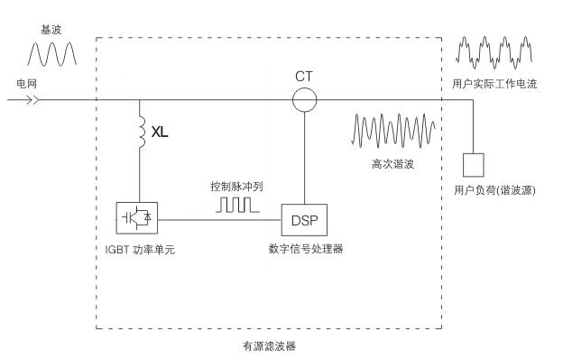有源濾波器通過CT實時檢測線路電流,并把被檢測到的諧波轉(zhuǎn)化為數(shù)字信號處理器中的控制信號。同時,數(shù)字信號處理器產(chǎn)生一系列脈寬調(diào)制信號,驅(qū)動IGBT功率模塊通過線路電抗器向電網(wǎng)輸出相位正好與電網(wǎng)諧波電流方向相反,而幅值大小相等的電流,兩種諧波電流正好相互抵消,從而達(dá)到濾除諧波、凈化電網(wǎng)電流的目的。